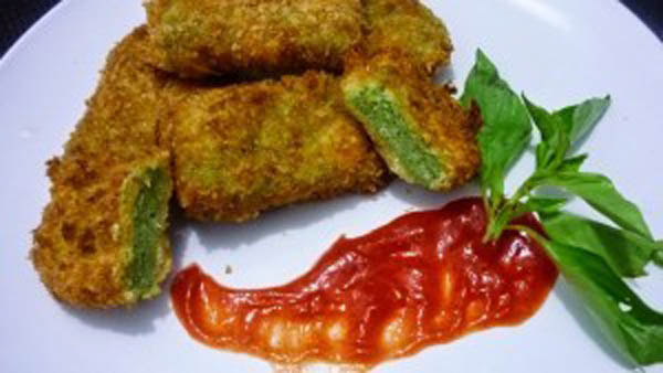 • Cetak atau potong sesuai selera. Gulingkan ke dalam tepung terigu, celupkan ke dalam kocokan telur, lalu gulingkan kembali ke dalam tepung roti. Masukkan kembali ke dalam freezer hingga agak mengeras.