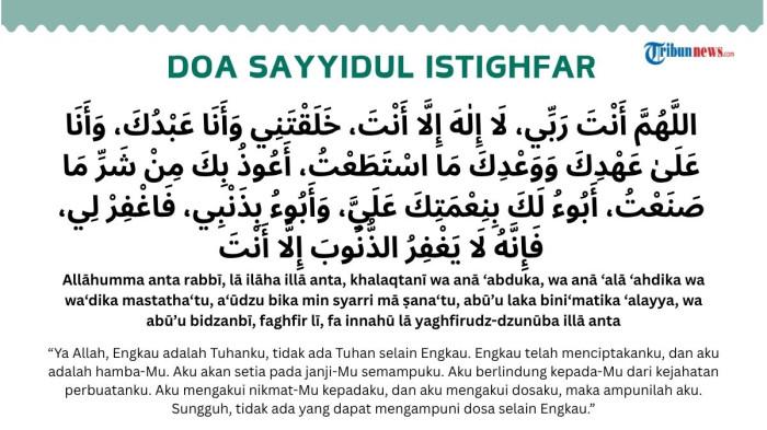 Artinya: “Ya Allah, Engkau adalah Tuhanku, tidak ada Tuhan selain Engkau. Engkau telah menciptakanku, dan aku adalah hamba-Mu. Aku akan setia pada janji-Mu semampuku. Aku berlindung kepada-Mu dari kejahatan perbuatanku. Aku mengakui nikmat-Mu kepadaku, dan aku mengakui dosaku, maka ampunilah aku. Sungguh, tidak ada yang dapat mengampuni dosa selain Engkau.” (HR. Shahih al-Bukhari, no. 6306).