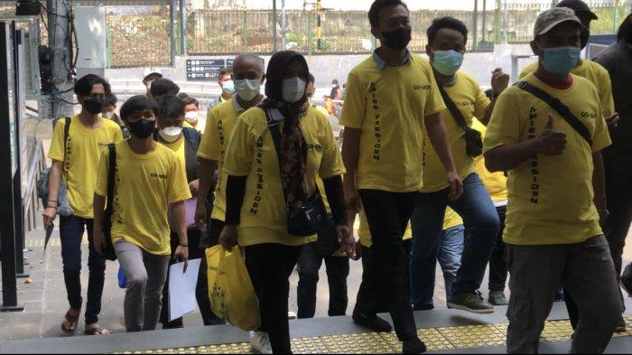 Kompak Berseragam Kuning, Relawan Anies Naik Transportasi Umum Hadiri Temu Kebangsaan di Senayan