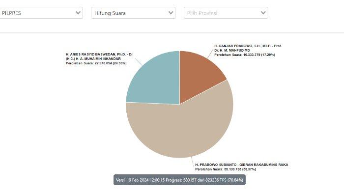 Perolehan suara yang diraih Prabowo Subianto-Gibran Rakabuming Raka saat ini mencapai 58 persen berdasarkan hasil hitungan sementara oleh Komisi Pemilihan Umum (KPU).