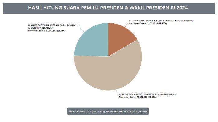 TRIBUNNEWS.COM - Berikut real count sementara Pilpres 2024 dari Komisi Pemilihan Umum (KPU) per Kamis (29/2/2024) pukul 10.00 WIB.
