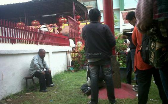 TRIBUNNEWS,COM, JAKARTA - Syahidan Marpaung, seorang pria dewasa asal Medan Sumatera Utara, sontak menjadi perhatian para pewarta foto yang sedang mengabadikan suasana Imlek di Wihara Dharma Bhakti, Petak Sembilan, Glodok, Jakarta Pusat, Senin (23/1/2012).