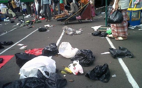 Setelah salat selesai, masjid terbesar di Asia Tenggara dipenuhi ratusan sampah. Sampah yang terdiri dari plastik dan kertas koran mengotori halaman Masjid Istiqlal.