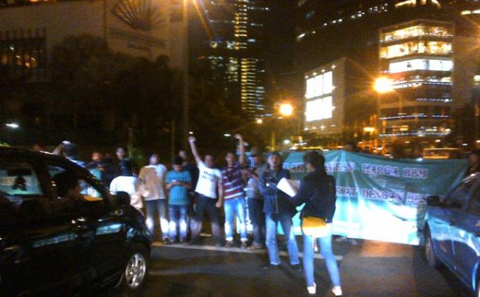 TRIBUNNEWS.COM, JAKARTA - Puluhan orang yang tergabung dalam Himpunan Masyarakat Indonesia (HMI) sempat melakukan aksi penutupan jalan di Bundaran HI menuju jalan Sudirman, Jumat (21/6/2013) sekitar pukul 20.15 WIB.