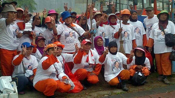 Masih menggunakan seragam kebesaran berwarna orange dan membawa sapu lidi yang sehari-harinya mereka gunakan untuk menyapu jalanan ibukota, ratusan tukang sapu jalanan itu tampak bersemangat untuk mendukung Jokowi.