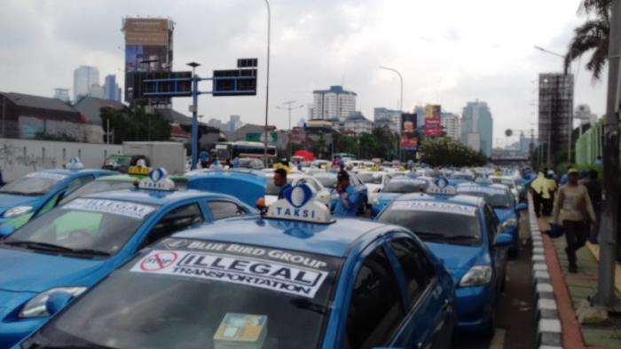 Ratusan armada transportasi darat seperti taksi dan bajaj diparkir di ruas jalan depan gedung DPR/MPR, Jalan Gatot Soebroto
