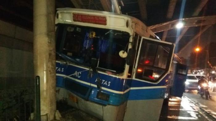 TRIBUNNEWS.COM, JAKARTA - Bus Patas AC42 rute Cielungsi - Tanjung Priok B7613XB menabrak sebuah tiang Jembatan Penyeberangan Orang (JPO), tepatnya di di depan Halte Transjakarta By Pass Pulomas, Pulogadung, Jakarta Timur, pada Jumat (28/10/2016).