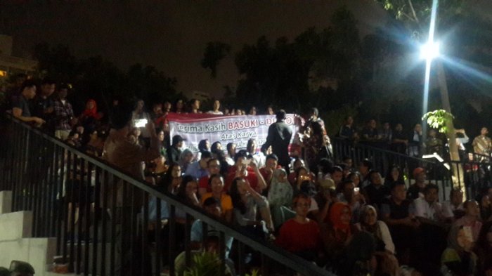 "Terima Kasih Basuki Djarot atas karya revitalisasi ruang terbuka hijau Lapangan Banteng," tulisan dispanduk.