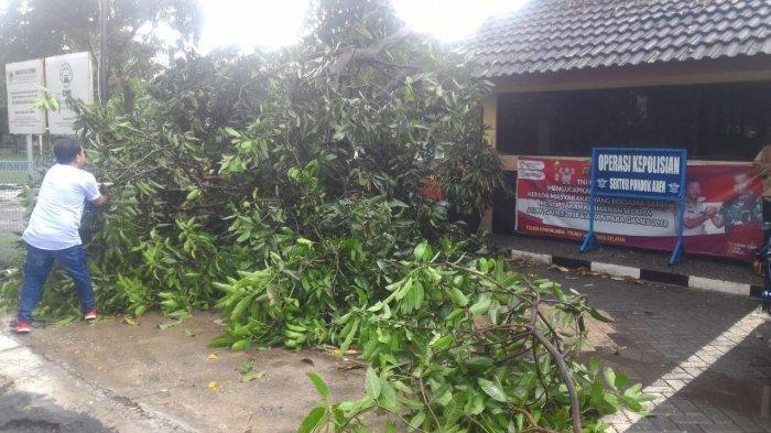 Tepatnya di samping Pos Polisi Graha Bunga, di depan Masjid Azzahra, pohon mangga berukuran cukup besar menimpa sepeda motor yang terparkir.