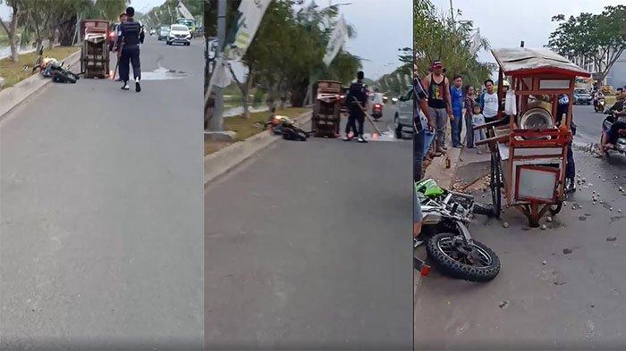 Terlihat satu unit motor tergeletak di samping gerobak bakso yang hampir terbalik.