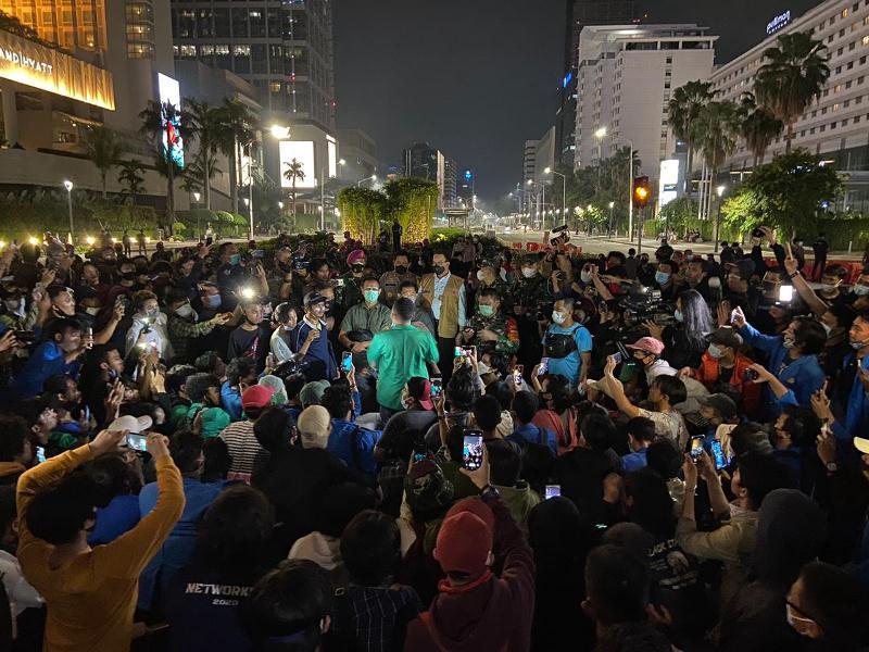 TRIBUNNEWS.COM, JAKARTA - Gubernur DKI Jakarta Anies Baswedan menyempatkan temui massa aksi unjuk rasa penolakan Omnibus Law UU Cipta Kerja di kawasan Bundaran HI, Jakarta Pusat, Kamis (8/10/2020) malam.