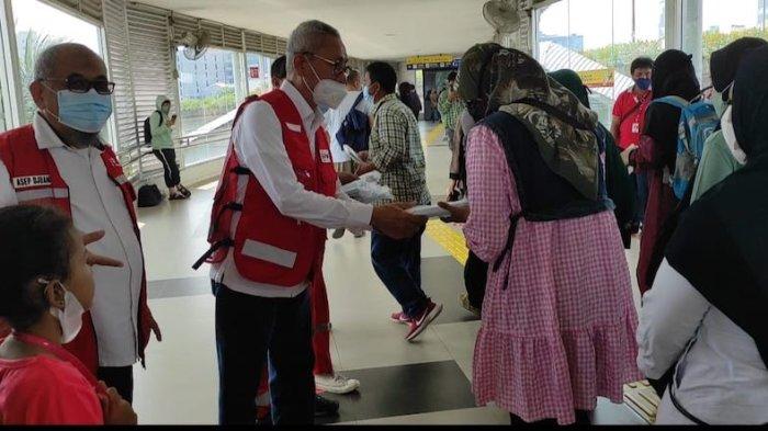 TRIBUNNEWS.COM, JAKARTA - Palang Merah Indonesia (PMI) Jakarta Pusat membagikan 6.000 masker gratis di tiga stasiun di Jakarta, pada masa arus Mudik dan Balik Lebaran 2022, Sabtu (7/5/2022).