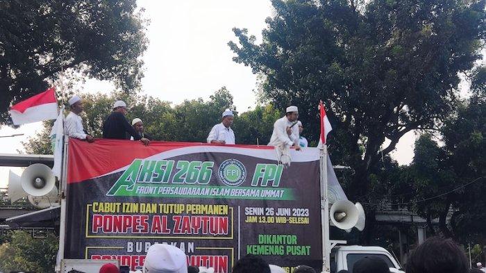 Sementara itu sebelumnya pantauan Tribunnews.com di lokasi demo, massa aksi di Kementerian Agama, FPI membentangkan spanduk tuntutan bertuliskan cabut dan tuntut permanen serta bubarkan ponpes Al Zaitun. Karena jelas ajarkan ideologi sesat kepada santrinya.