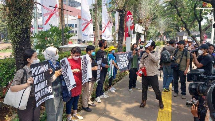TRIBUNNEWS.COM, JAKARTA - Puluhan masyarakat Jakarta yang tergabung dalam Koalisi Ibukota menggelar aksi di Balai Kota DKI Jakarta menuntut Pemprov DKI lebih serius menangani polusi udara di Jakarta yang kini banyak dikeluhkan dan mengancam kesehatan warga, Rabu (16/8/2023).