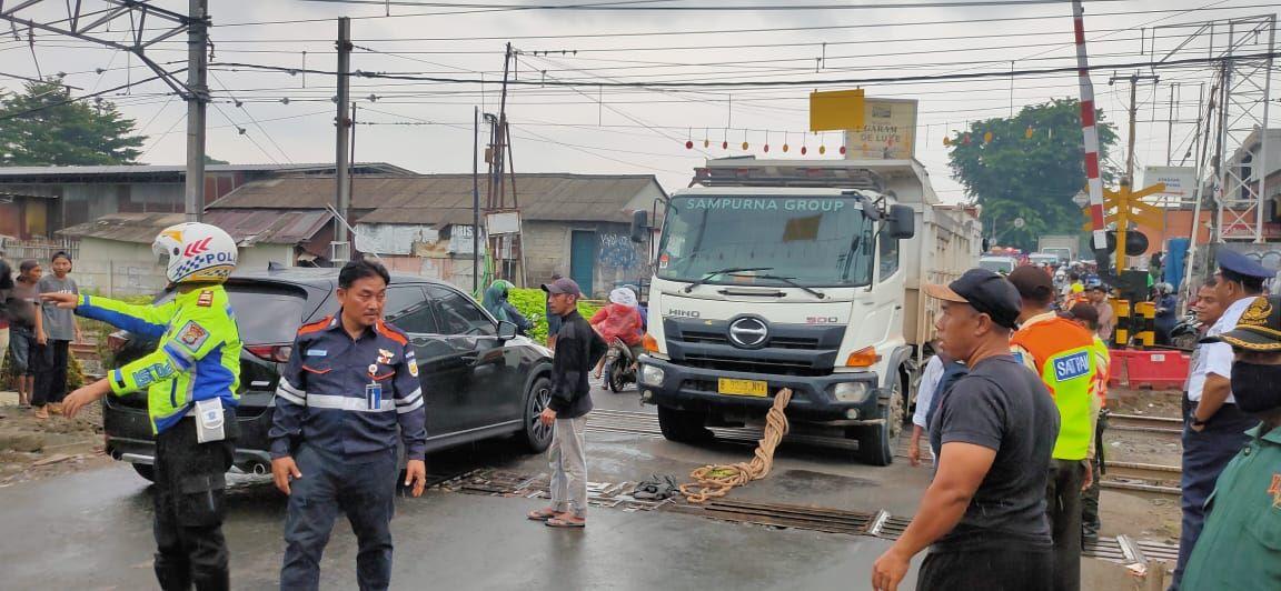 Insiden truk Hino patas as roda di perlintasan kereta api Serpong ini menyebabkan 17 perjalanan KRL terganggu.