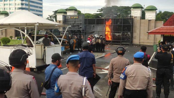 Massa aksi yang tergabung dari elemen mahasiswa dan juga masyarakat mulai mencoba merangsek masuk ke halaman depan Gedung DPR RI