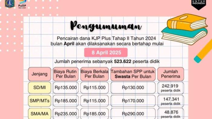 Dinas Pendidikan (Disdik) Provinsi DKI Jakarta telah mengumumkan pencairan bantuan KJP Plus tahap 2 tahun 2024 yang cair secara bertahap mulai 8 April 2025.