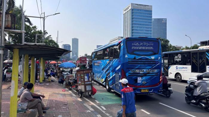 Pantauan Tribunnews, massa buruh yang berasal dari wilayah sekitar Jakarta berbondong-bondong pulang menggunakan bus angkutan yang telah disiapkan.