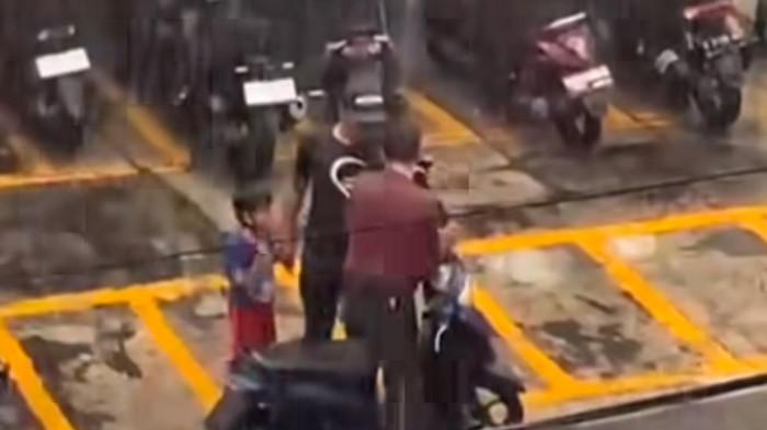 Salah satu pengendara motor berwarna putih yang membawa anak kecil terlihat tak terima.