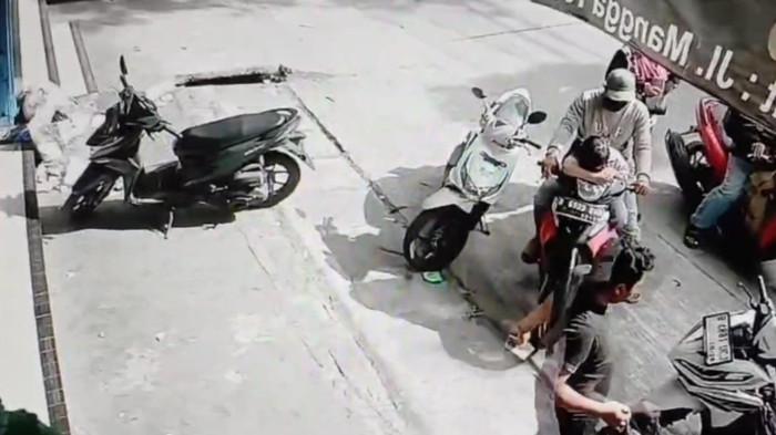 Dalam gambar yang ditangkap CCTV, terlihat pelaku utama seorang pria mengendarai sepeda motor membonceng istri dan anaknya, berhenti di depan toko sembako.