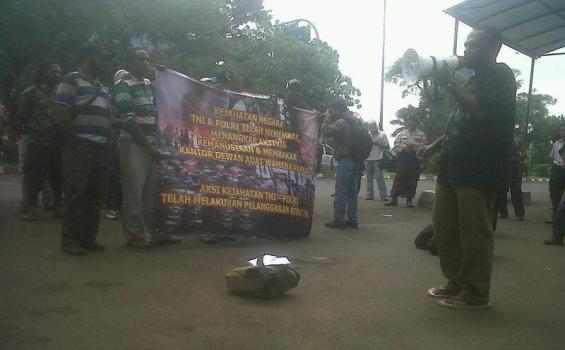 Selain itu, mereka pun menuliskan tuntutan mereka dalam sebuah karton 'Aksi kejahatan TNI-Polri telah melakukan pelanggaran bertat HAM' dan 'TNI-Polri Hanya sekurity untuk mengamankan kepentinga asing di Papua'.