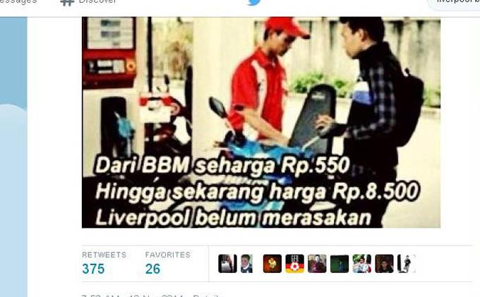 Sebabnya, berbagai gambar sindiran atau meme tentang Liverpool turut menghiasi jagad sosial media seusai Presiden Joko Widodo mengumumkan kenaikan harga BBM, Selasa (18/11/2014).