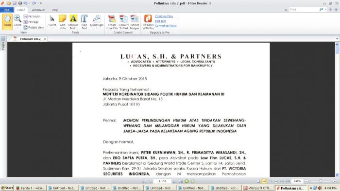 "Kami mohon perlindungan hukum ke Menkopolhukam atas tindakan sewenang-wenang dan melanggar hukum yang dilakukan jaksa-jaksa pada Kejaksaan Agung RI," ujar Kuasa Hukum PT VSI Peter Kurniawan dalam pernyataannya, Kamis(15/10/2015).