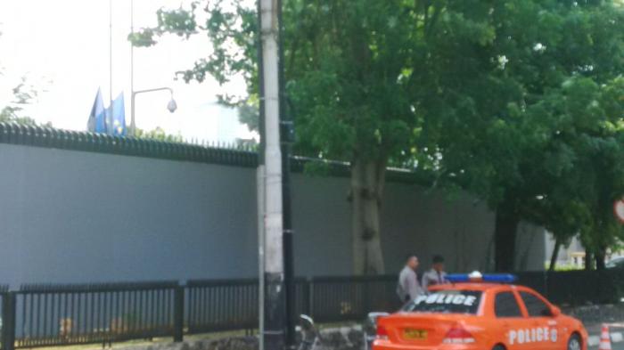 Di bagian depan Kedubes, tampak satu mobil patroli Polres Jakarta Pusat dengan dua anggota sabhara melakukan penjagaan.