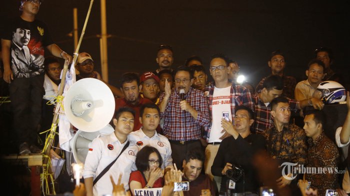 TRIBUNNEWS.COM, JAKARTA - Gubernur Jakarta yang baru saja dilantik menggantikan Basuki Tjahaja Purnama, Djarot Syaiful Hidayat hadir di tengah massa pendukung Ahok di depan Lapas Kelas I Cipinang, Jakarta Timur, Selasa (9/5/2017) sekitar pukul 21.30 WIB.