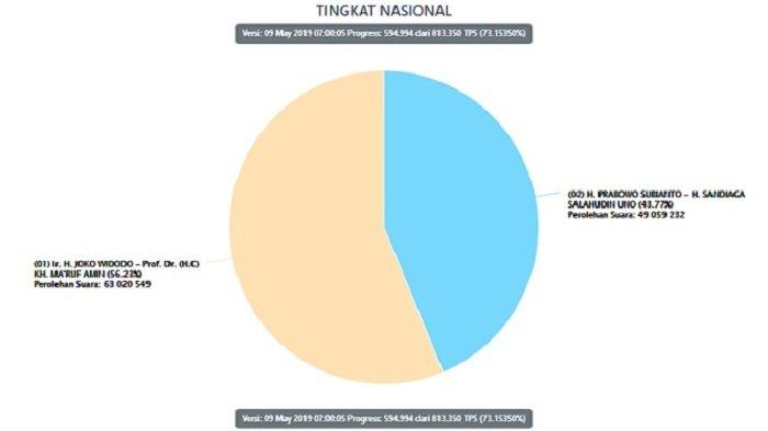 Dari pantauan Tribun di situs resmi KPU, progres penghitungan berdasarkan scan C1 tingkat nasional saat ini telah mencapai kisaran 73 persen atau 594.988 TPS.