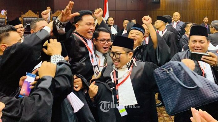 TRIBUNNEWS.COM, JAKARTA - Pada akhirnya, setelah melalui pembacaan risalah persidangan selama sembilan jam, Mahkamah Konstitusi (MK) memutuskan menolak seluruh permohonan Tim Hukum Prabowo-Sandi dalam sengketa perselisihan hasil pemilihan umum (PHUP) yg digelar sejak 14 juni lalu. Dalam putusan yg dibacakan secara bergantian oleh 9 (sembilan) hakim MK sejak pukul 12.30 siang hingga pukul 21.13 pada Kamis 26 juni 2019, akhirnya ketua MK Anwar Usman mengetuk palu dan meyatakan permohonan pemohon prabowo - sandi, ditolak untuk seluruhnya.