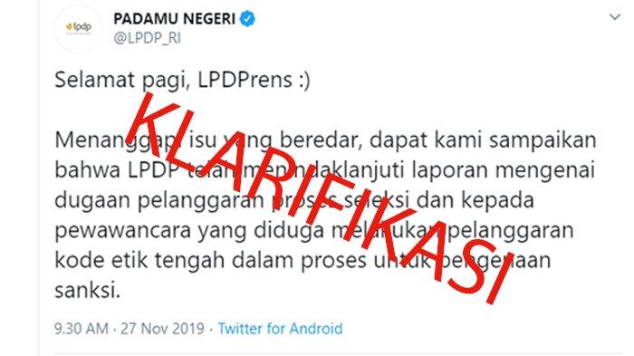 Menanggapi isu yang beredar, dapat kami sampaikan bahwa LPDP telah menindaklanjuti laporan mengenai dugaan pelanggaran proses seleksi dan kepada pewawancara yang diduga melakukan pelanggaran kode etik tengah dalam proses untuk pengenaan sanksi," cuit LPDP, Rabu (27/11/2019).