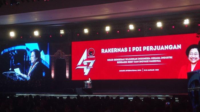 TRIBUNNEWS.COM, JAKARTA - Ketua Umum PDI Perjuangan Megawati Soekarnoputri menyampaikan pidato politik dihadapan para kadernya di Rapat Kerja Nasional (Rakernas) I PDIP sekaligus HUT ke-47, Jumat (10/1/2020).