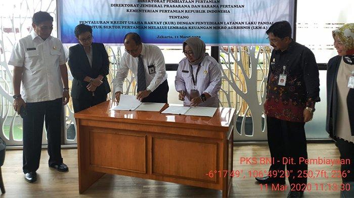 TRIBUNNEWS.COM, JAKARTA - Kementerian Pertanian (Kementan) melalui Direktorat Jenderal Prasarana dan Sarana Pertanian (PSP) menandatangani kerja sama dengan PT Bank Negara Indonesia (Persero) Tbk terkait Kredit Usaha Rakyat (KUR).