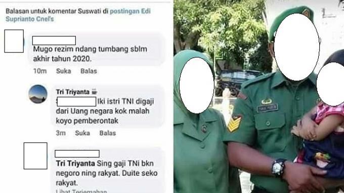 "Iki istri TNI digaji dari uang negara kok malah koyo pemberontak (Ini istri TNI digaji dari uang negara kok malah seperti pemberontak)," tulis akun Tri Triyanta.