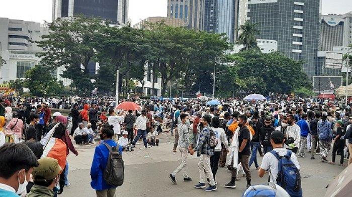 Massa pengunjuk rasa tolak UU Cipta Kerja terlihat berkerumun dan tak menjalankan jaga jarak di kawasan Patung Kuda Arjuna Wijaya, Jalan Medan Merdeka Barat, Jakarta Pusat, Selasa (13/10/2020).