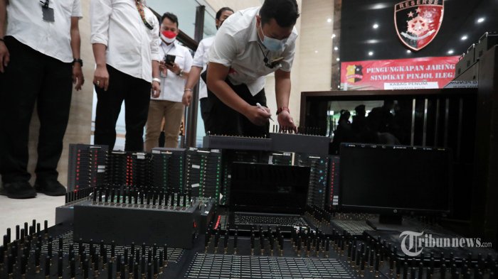 Petugas menunjukkan tersangka dan barang bukti saat ungkap kasus jaringan sindikat pinjaman online (pinjol) ilegal di gedung Bareskrim Polri, Jakarta, Jumat (15/10/2021). Direktorat Tindak Pidana Ekonomi Khusus (Dirtipideksus) Bareskrim Polri menangkap tujuh tersangka di lima tempat kejadian perkara dengan mengamankan sejumlah barang bukti berupa monitor, modem pool, dan laptop. TRIBUNNES/IRWAN RISMAWAN (TRIBUNNEWS/IRWAN RISMAWAN)