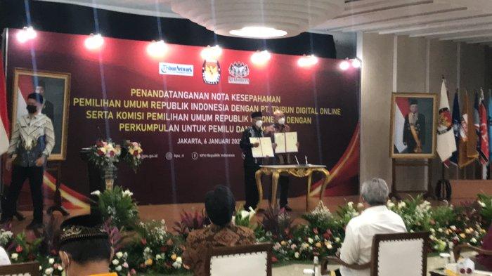 Ketua KPU RI Ilham Saputra dan Direktur Pemberitaan Tribunnetwork Febby Mahendra Putra melakukan penandatanganan tersebut di kantor KPU, Jakarta, Kamis (6/1/2022).