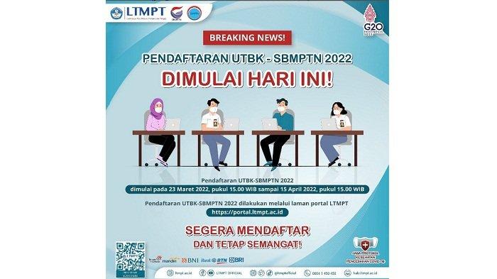 TRIBUNNEWS.COM - Tahapan pendaftaran UTBK-SBMPTN 2022 resmi dibuka pada hari ini, Rabu 23 Maret 2022 pukul 15.00 WIB hingga 15 April 2022.