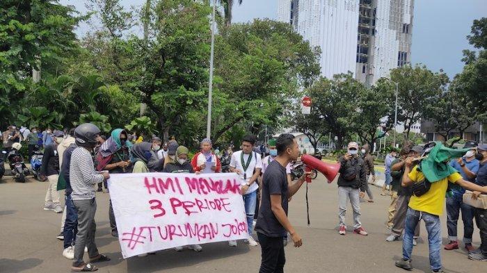 TRIBUNNEWS.COM, JAKARTA - Massa dari Himpunan Mahasiswa Islam (HMI) melakukan orasinya di kawasan Patung Kuda Arjuna Wiwaha, Jakarta Pusat, Senin (11/4/2022) siang.