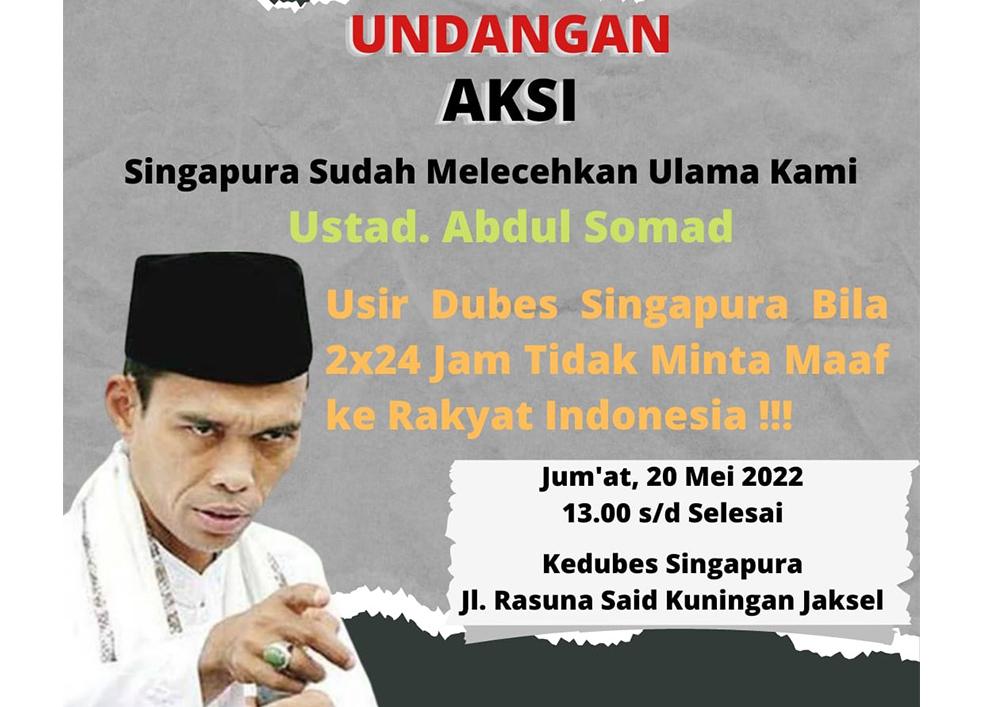 “UNDANGAN AKSI. SINGAPURA Sudah Melecehkan Ulama Kami Ustadz Abdul Somad,” demikian tulis isi poster itu.