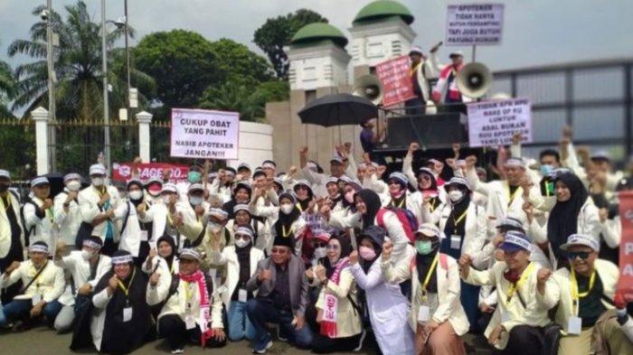 TRIBUNNEWS.COM, JAKARTA - Ratusan apoteker anggota Ikatan Apoteker Indonesia (IAI) berunjuk rasa menuntut disahkannya RUU Praktik Apoteker di Gedung DPR RI Jakarta, Rabu (8/6/2022).