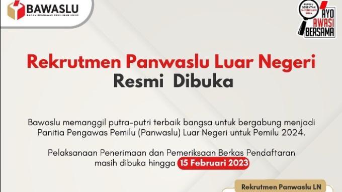 Bawaslu membuka pendaftaran Panwaslu luar negeri untuk Pemilu 2024 hingga besok, Rabu 15 Februari 2023, peserta dapat segera mendaftar di KBRI.