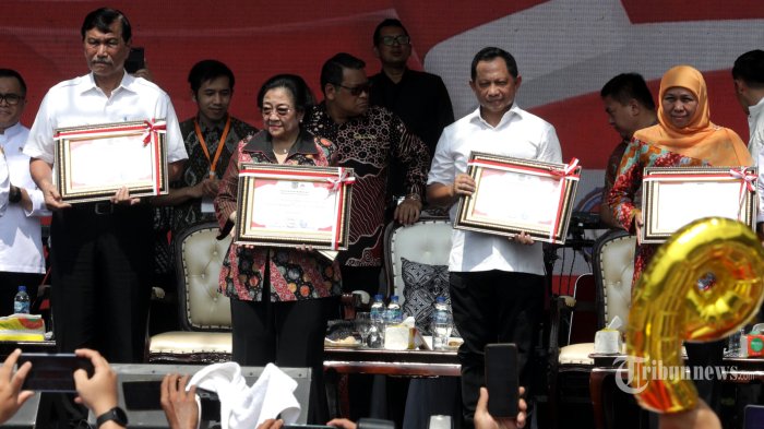Ketua Umum PDI Perjuangan ini diapit Khofifah dan Tito Karnavian.