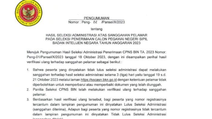 BIN telah mengumumkan hasil seleksi administrasi pasca sanggah CPNS 2023 pada Jumat (27/10/2023).