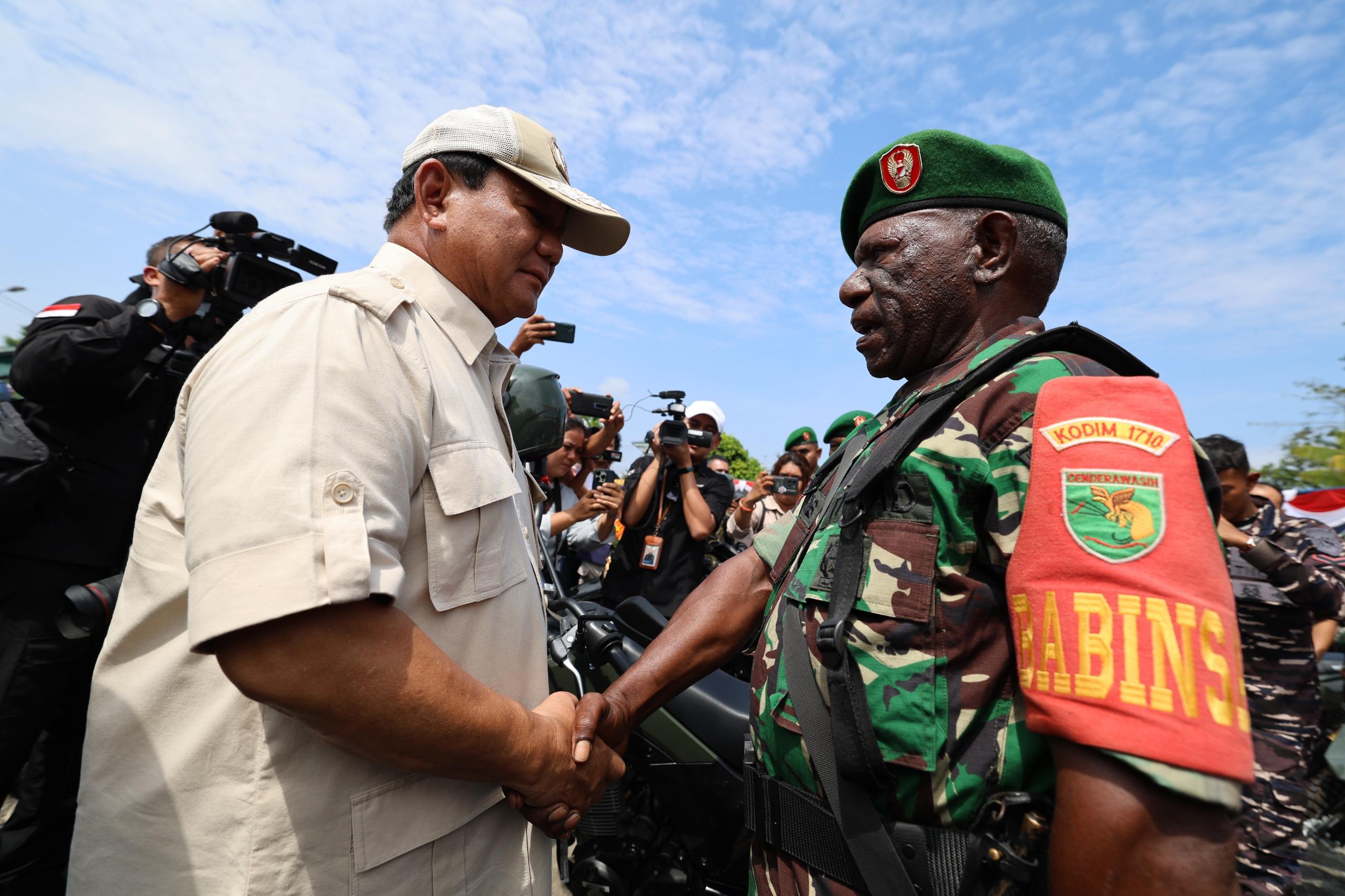 Menteri Pertahanan Prabowo Subianto disambut antusias oleh warga di Mimika, Papua termasuk para siswa SD dan SMP, hingga ibu-ibu setempat yang antre ingin bersalaman dan berfoto bersama dengan Prabowo.