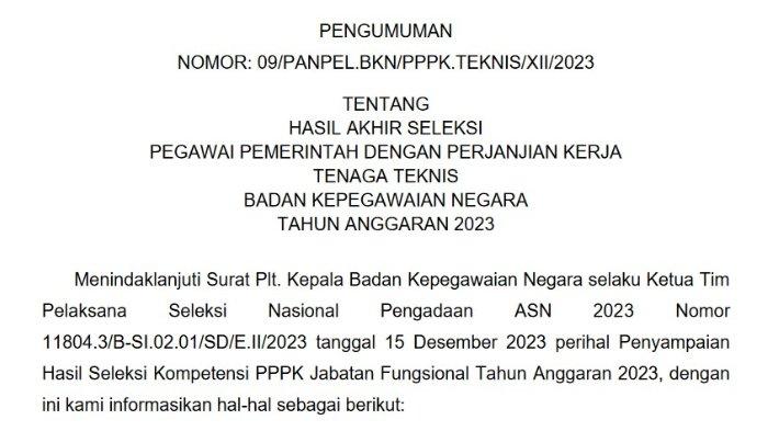 TRIBUNNEWS.COM - Hasil akhir seleksi pengadaan Pegawai Pemerintah dengan Perjanjian Kerja (PPPK) Badan Kepegawaian Negara (BKN) tahun 2023 telah diumumkan.