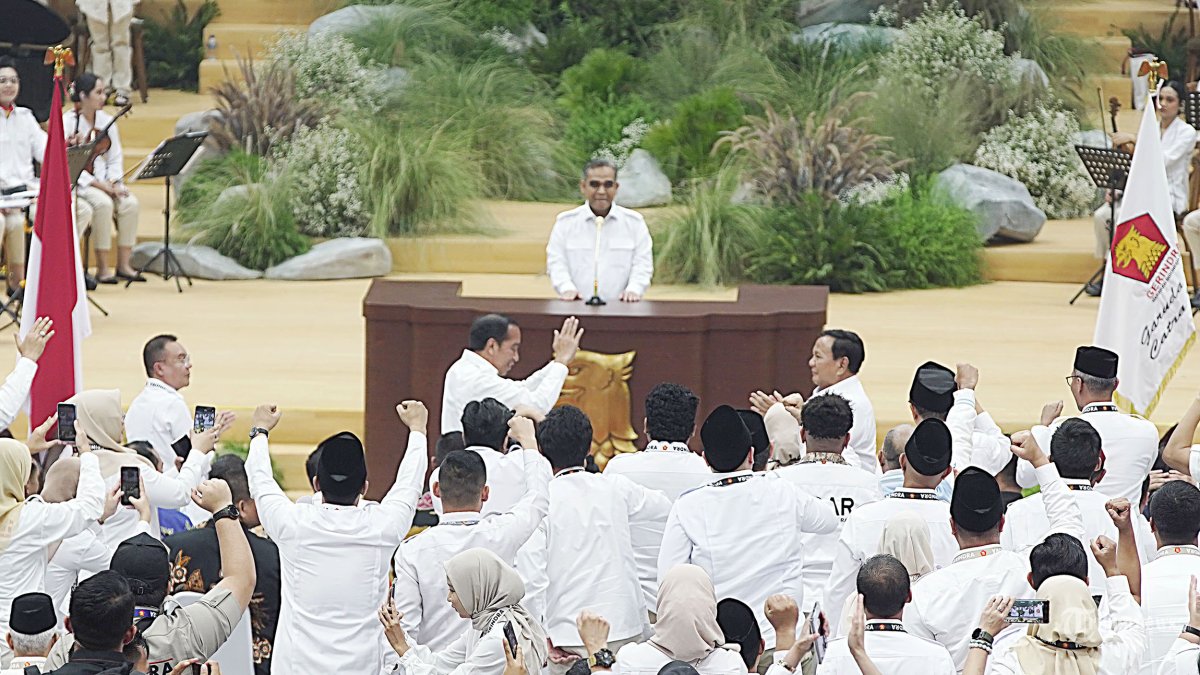 Saat Presiden Jokowi dan Presiden terpilih Prabowo Subianto saling memuji dalam penutupan Rapimnas Partai Gerindra, Sabtu (31/8/2024).