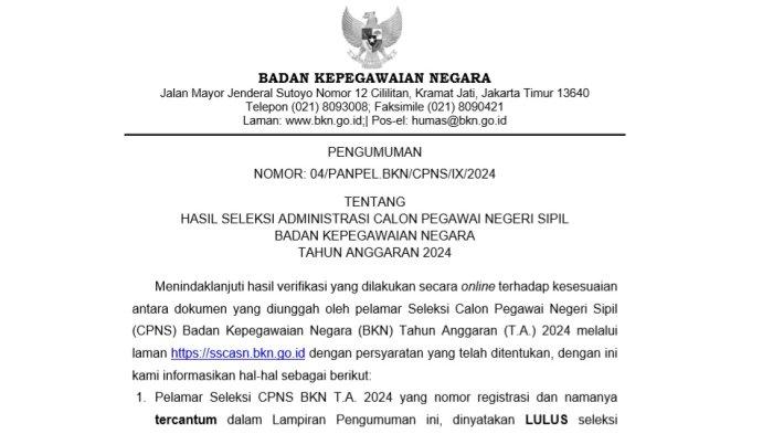 Adapun pengumuman hasil seleksi administrasi CPNS BKN 2024 dapat dilihat di link berikut: KLIK