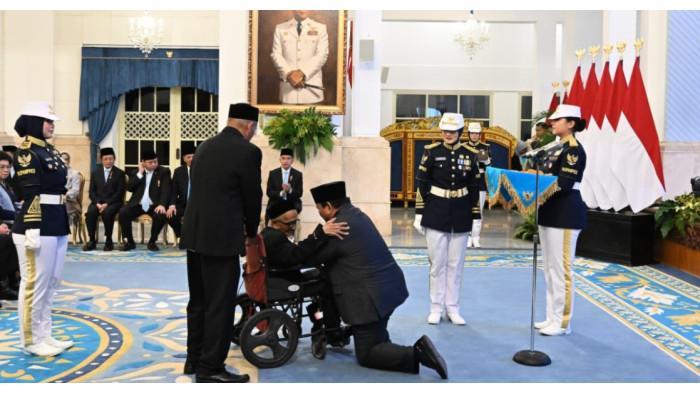 Dalam kesempatan tersebut, Presiden Prabowo tampak berlutut di hadapan Nyak Sandang untuk mengalungkan dan menyematkan tanda kehormatan.